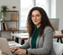 Junge Frau lächelt am Schreibtisch in einem hellen Büro, hält ein Smartphone, mit Aktenordnern im Hintergrund.